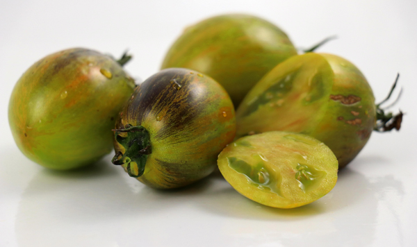“Atomic Fusion” is an eye-catching larger selection of Brad’s Atomic Grape. The reviews by home gardeners rated Atomic Fusion excellent for flavor and productivity as well as beautiful appearance. I can certainly vouch for the productivity. In fact it produced more fruit than any other tomato in my garden this year. I did have two major problems with Atomic Fusion though, and they were due entirely to my climate. At least 80% of my fruits split badly, often while still quite green. By the time I can get out in the morning after a night’s thunderstorm, the fruit flies have already laid eggs in the cracked fruits. If I cannot deseed them the same day, there will be larvae swimming inside the tomato…horrible. The only fruits I could salvage were those picked far too early, and because of this the flavor was not at all sweet. All reviews remarked on the incredibly sweet flavor, very appealing even to children. Mine were quite puckery and the texture was poor by the time they were ripe enough on my counters to deseed. My recommendation would be to grow this really excellent variety if you live in areas that do not fluctuate between dry + heat and monsoon + heat. You will be truly impressed with the heavy clusters of fruits hanging all over the plant, from deep in the plant to the very top. I expect that you will also be impressed with the flavor and texture when the fruits are able to ripen on the vine.