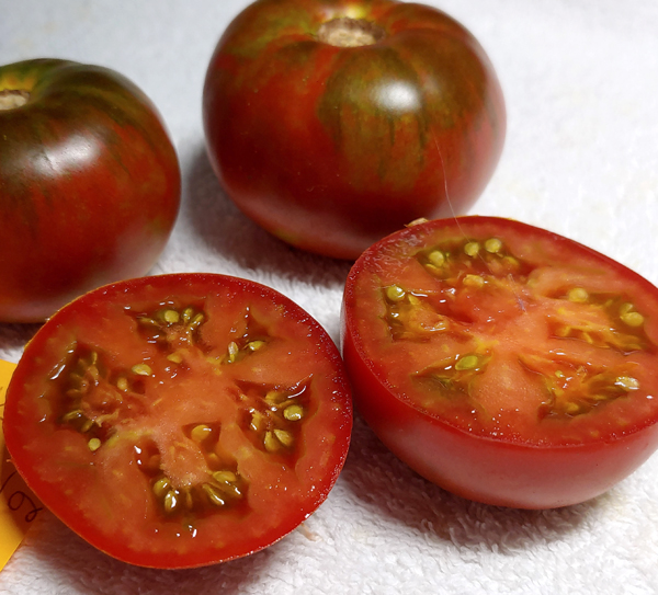 “Bayou Dusk” is a Bunny Hop Seeds Original Creation. This chocolate (deep red flesh, chlorophyll retained, yellow epidermis) salad is a sister line to two other segregants of the same cross: Bayou Sun and Bayou Moon. Bayou Moon is the first release in this series and Bayou Sun is the second. The parents in this cross were Green Mustang (GWR beefsteak) x ATVO0102 (beta carotene cocktail from Africa with nematode and bacterial wilt resistance as well as moist heat tolerance). I kept this segregant back a little in the interest of a stabilized open-pollinated variety. Bayou Dusk’s flavor is rich and balanced with sweet and acid. It has the genetic inheritance of green shoulders that is associated with a more intense flavor than those without them. These are 4 to 6oz juicy salads, similar to Bayou Sun and Bayou Moon. It produces perseveringly, even setting (small) fruit on a plant in a 4” pot that I didn’t have the chance to set out…we’re talking maybe 1 to 2 cups of soil mix in that little pot. I believe that it is stable; however, I never fully trust these things, so I will mark it as a developing variety.