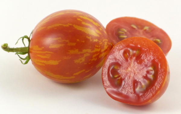 “Bonté Tigret” is a most striking looking variety, in both plant and fruit. It is a short dwarf plant with rugose chartreuse leaves. The fruits are fat striped bullets of red and gold. The flesh is a deep crimson red. Bonté Tigret was disseminated in the US by Luc Fishot of Belgium.