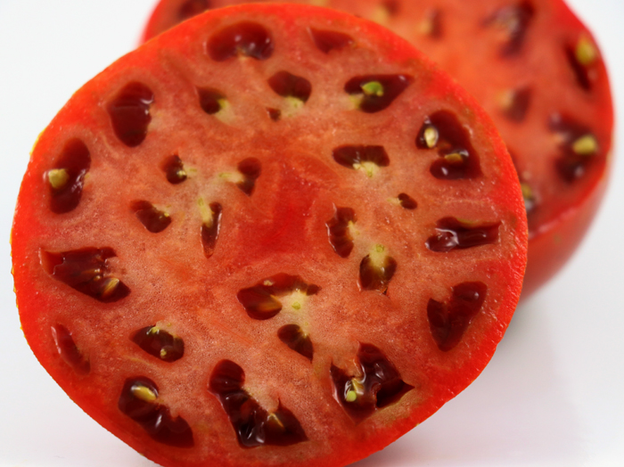 “Buffalo Soldier” is a type of tomato that I privately refer to as “manly.” What I mean is that the fruits and the plant are strong and bold, in flavor and habit. Buffalo Soldier is a big chocolate beefsteak, segregated out from a cross of Indian Stripe x Big Beef F1 made by John Beidler of Connecticut, with growout and selection by Bill Jeffers of Indiana. Since this variety is said to have both chocolate and purple forms in circulation, I made certain to verify the epidermis color, which was yellow.