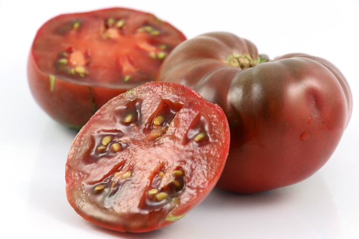 “Daniel Burson” is a prolific purple (chlorophyll-retained red flesh with clear epidermis) beefsteak tomato that appeared in the garden of Bill Jeffers of Evansville, Indiana. This may have been the result of a possible cross between Indian Stripe and Daniels. This is one of the very few beefsteak varieties that sets more than four fruits per plant (my usual average for beefsteak varieties is 0 to 4 fruits per plant) in my challenging Florida panhandle climate. It even survived the summer and now in September is bravely wearing two little green fruits. I am a huge fan of purple tomatoes, and Daniel Burson doesn’t disappoint with its rich, tangy and sweet flavor.