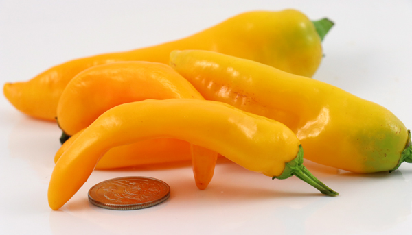 “Doux Long d’Antibes” (Sweet and Long from Antibes) is an heirloom variety from southeast France. I grew it in 2013 from seeds I bought from the vendor Cherry Gal. That was before I began bagging blooms, and so when I tried to grow it the following year from saved seeds I ended up with a hot large orange horn. I could not find the seeds in the United States again. Doux Long d’Antibes is sold popularly in Europe, but not here…which I think is foolish because this is the most delicious and fragrant pepper, reminding me of childhood Juicy Fruit gum. I am so pleased to be able to offer it now. This is a rather short plant, around 2 to 3ft tall in a 7-gal grow bag. The fruits are rather narrow and elongated (not so tapered as a typical horn shaped pepper), and are more orange-yellow at full ripeness. Reading the descriptions from various vendors, I found that some describe it as having a mild heat while others state that it is sweet with no heat. On mine the flesh was sweet with no heat but the seeds have a tiny tingle. If grown in the summer heat with little water, I can imagine that the mild heat might permeate the flesh.
