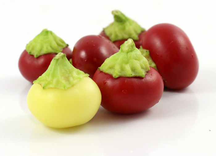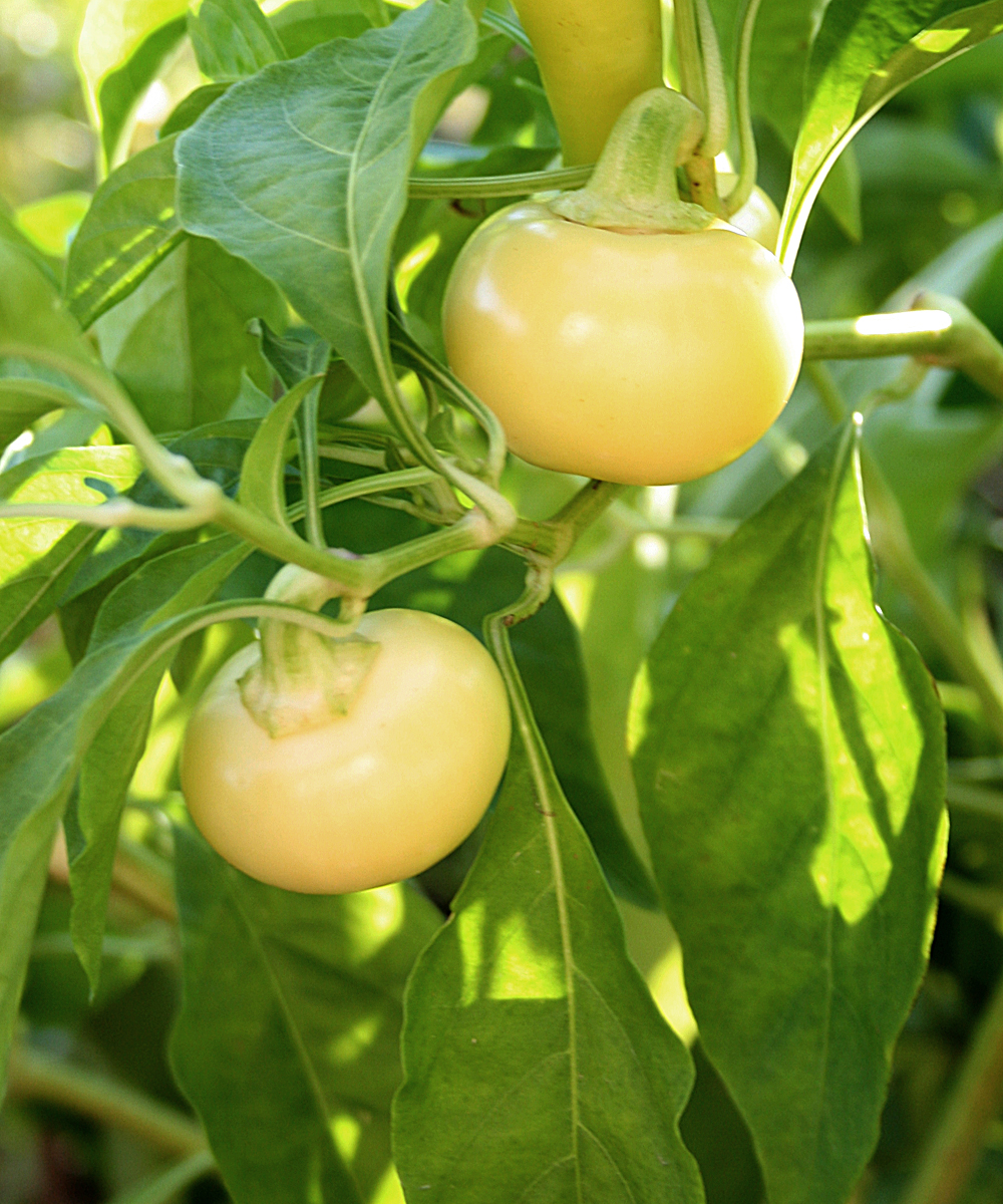 “Garai Fehér Cseresznye” is a beautiful ivory cherry pepper, very hot, that turns bright cherry red when fully ripe. I have a difficult time keeping the stink bugs from them because at red ripe there is sweet with the heat, and stink bugs seem to love sweet, whether it be peppers or tomatoes. These are quite thick-walled and smaller than the common hot cherry bomb pepper types. I grew this hot cherry in a 3 gallon black nursery pot this year, and the plant reached 24″ tall and 18″ wide. It does grow larger when given more room for its roots, such as in a larger pot or in the ground. It fruited profusely even in the small pot despite much neglect and lack of watering in the mid-summer. My original seeds came from Hungary.