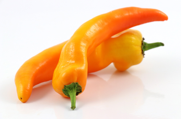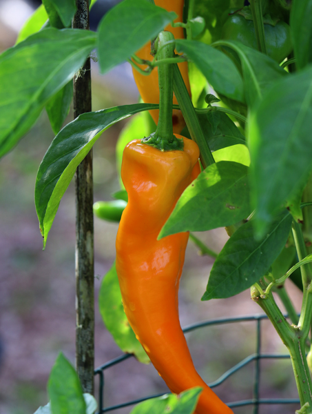 “Gatherer’s Gold Sweet Italian” is an original creation by Wild Garden Seed. I normally buy my salad greens seeds from Wild Garden, as they have the most wonderful variety of beautiful and delicious lettuces, mustards, and more…many of them original creations. I like to grow things that don’t look like what is in the grocery store (otherwise, why not just go to the grocery store?)…but I digress. Wild Garden’s description: “We did not expect the bright red hybrid parent of our pepper project to generate beautiful golden versions of the Italian. Large plants with long wrinkled tapered fruits and few seeds. Remains gold even at full maturity.” This pepper is a rich orange-gold. Not as orange as Giant Sweet Devil’s Horn, but more orange than Golden Treasure. The fruit size is marvelous, about 6 to 8” long in my garden (possibly larger in yours), and so useful for grilling, roasting, eating raw, and anything else you’d want to do with a yummy sweet pepper. Highly recommended!