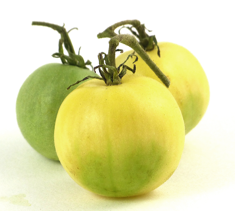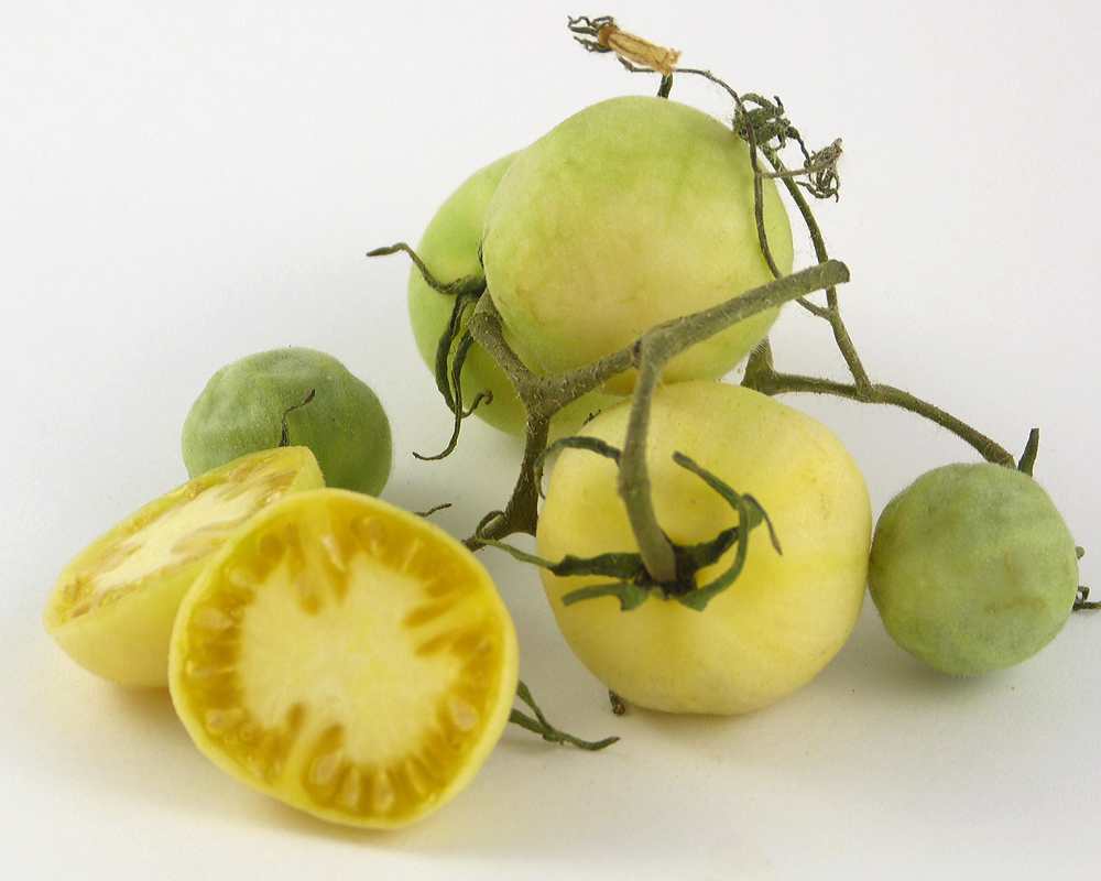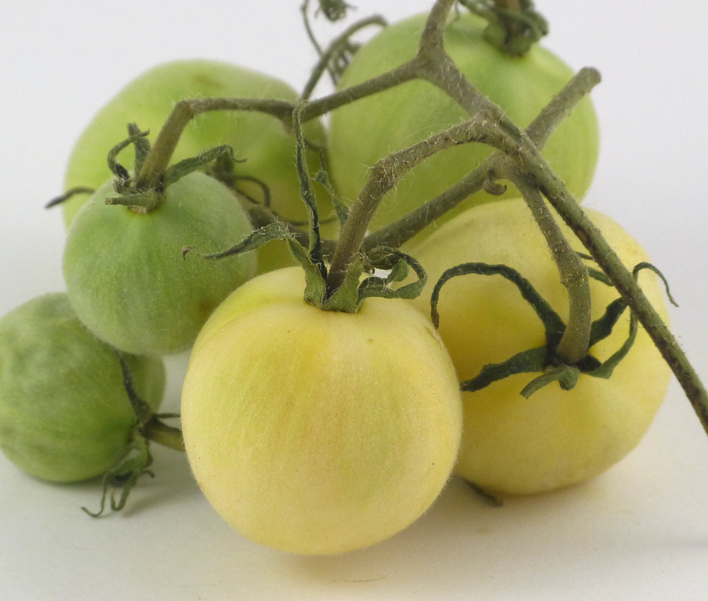 “Ghost Cherry” is a great saladette for someone who wants to grow something radically different than the grocery store slick red paintballs. It is white, with a soft suede-like skin…not really fuzzy angora, but with the gene that makes an almost tacky feel and seems to lack the waxy cuticle normally seen and felt.