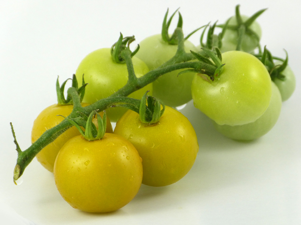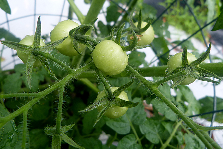 “Gobstopper” is a very interesting little tomato. The yellow and green coloring is unusual and attractive, and the flavor is difficult to describe. Some tasters found it to be sweet. The flavor lingers in your mouth for some time. I wasn't sure if I liked it, loved it, or didn't like it. You just have to try it yourself to see. The unripe fruits are beautiful, the palest white jade. Bred by Madeline McKeever, Ireland, from SunGold F1.