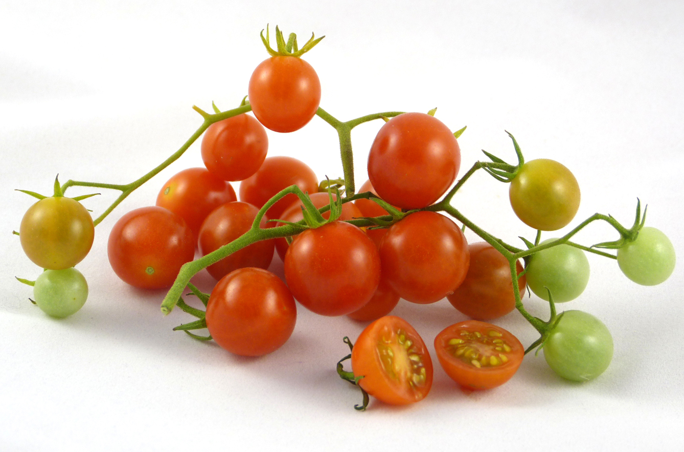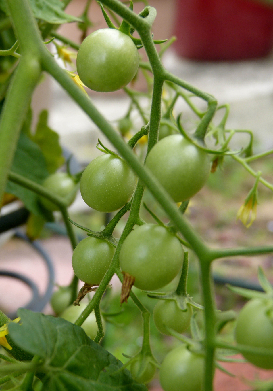 “Hundreds and Thousands” is a hanging basket variety that bears literally hundreds and thousands of currant-sized sweet red snackers. It is impossible for me to pass the plant without eating some of the ripe fruits.