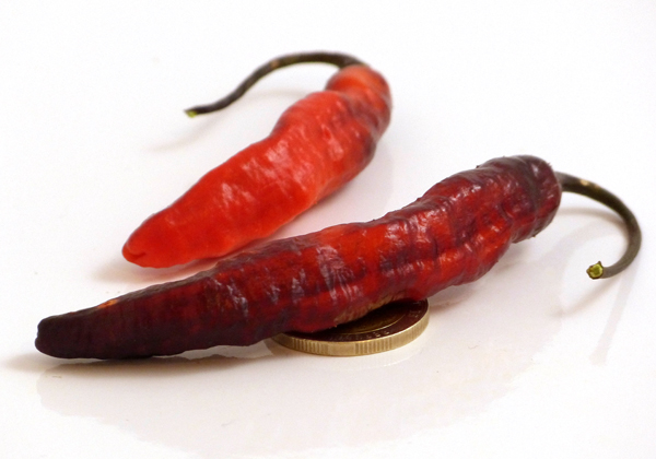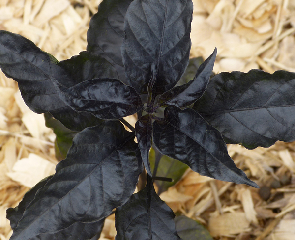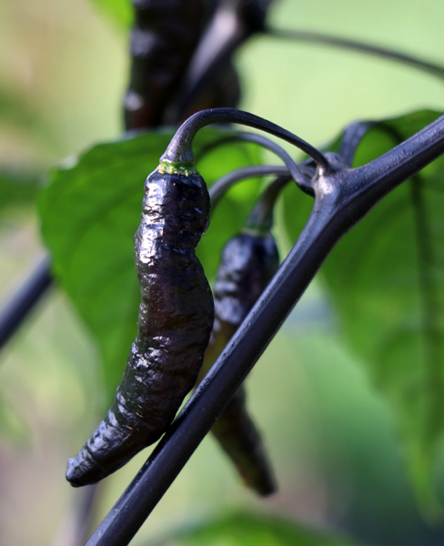 Mojo Blackie is a very hot chile created by Mojo Peppers. The parents are Bhut Jolokia x Pimenta da Neyde. In full sun, as I planted it this year, the unripe fruits were jet black that ripened to mostly but not completely red. The fruits look like glowing embers. Mojo Blackie appears to be a sister line to Mojo Scoundrel. Enrique at Mojo Pepper stated that he received this variety from Domenico “Mascalzone,” who is an Italian master grower, so I will guess that the original cross was made by Domenico. In a 7 gal grow bag the plant grew to 5 feet with slender black branches. You really have to look for the fruits. In full sun but cooler temperatures, the seedling plants may show black leaves (see photo) that turn green in the heat/adult plants. Another vendor has described the flavor as an “amazing rich” taste with a strong burn. I cannot verify this as I have developed an allergy to capsaicin since I started growing superhots in 2015. Even through my mask, though, I can smell the strong and seductive aroma unique to superhots.