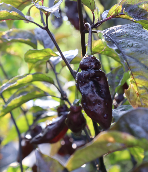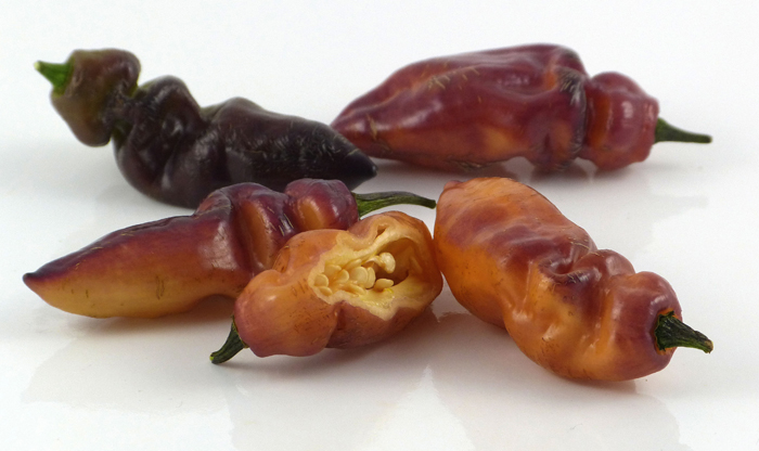 Mojo Scoundrel is a beautiful and hot chile resulting from a cross of Bhut (Jolokia?) to Pimenta da Neyde. Enrique at Mojo Pepper stated that he received this variety from Domenico “Mascalzone,” who is an Italian master grower, so I will guess that the original cross was made by Domenico. The segregate shown on Enrique’s site shows a pinkish fruit looking very like Ping Tiger, with purple spots and stripes. It is stated that the ripe color is cream. I found the same, except that I did not have vivid striping, and the color is more fawn than cream at ripeness. It is quite hot. A friend of mine makes powdered spice from this one, stating that it is her favorite, and tastier than the spice she made from Pink Tiger or from Yaki Blue Fawn. The unripe fruits are quite dark purple, and lighten with ripening. I will call this one C. chinense, but this is not a certainty. Pimenta da Neyde itself is said to be a hybrid C. annuum x C. chinense. Note: One packet per order please.