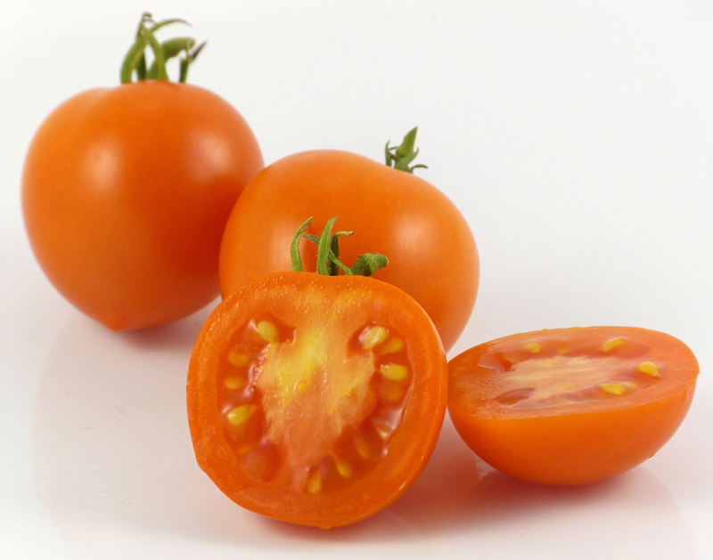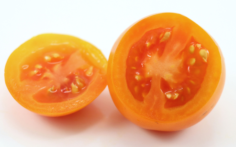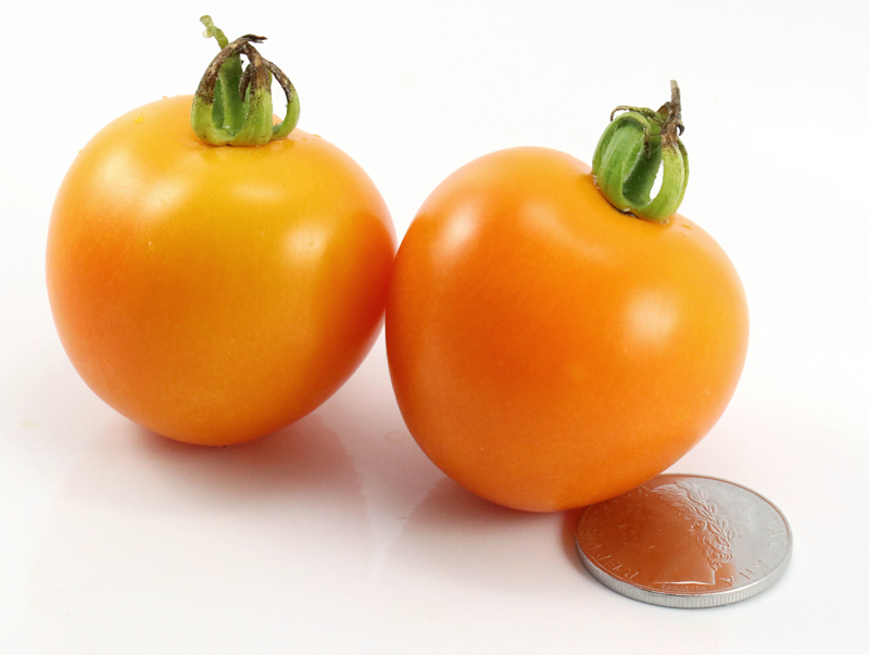 The fruits are produced in trusses, and the color of the inner flesh shows a pinkish-orange/red color that is characteristic of beta carotene content. The plant itself is interesting, taking after the ATVO 0102 parent in being one of those varieties that does not take on purple in the leaf veins etc. when the seedlings are cold and/or malnourished. As I have stated in the listing for Mica Red, I am not sure if this indicates the anthocyaninless gene or the anthocyanin absent gene, or neither one of those, but it does make for interesting seedling color in cool weather (bright yellow-green) and pretty green plants in good conditions.