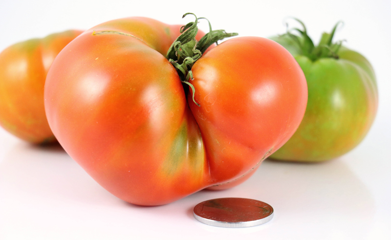 Pennheart is a stabilized segregate from Oxheart x Penn State Earliana, which was introduced in 1941 by the Pennsylvania Agricultural Experiment Station, State College, Pennsylvania. Sometimes you will see oblates and sometimes you will see blunt hearts. The flavor is really quite good, well-balanced between sweet and acid. The size and shape make it rather multipurpose. It is meaty enough for a loose tomato sauce, but juicy enough for slicing onto sandwiches or into salads. Mostly these fruits ranged from 3 to 7 ounces for me.