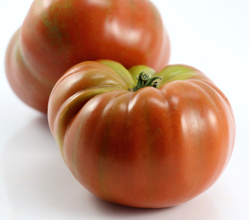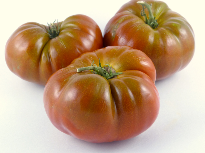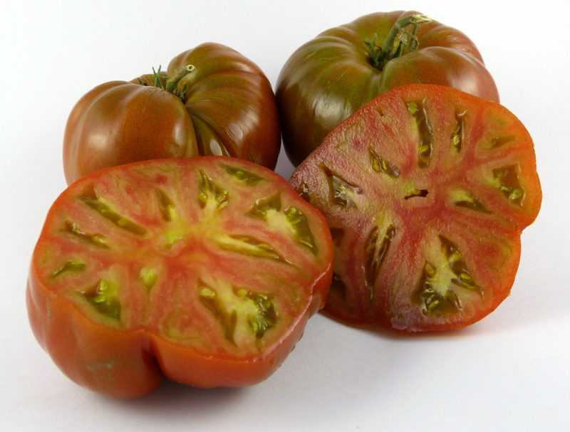 “Prime Rib” is an original creation by Bunny Hop Seeds. This is a deep reddish-chocolate beefsteak tomato, with a solid tomatoey flavor. It is not overly sweet, but has an excellent balance of sugar and acid. I chose the name “Prime Rib,” because the thick meaty slices reminded me of excellent quality aged beef from a fancy steak restaurant. Not the wimpy fake pinkish red of supermarket steaks, but the real dark brownish red of aged beef with complex flavors.