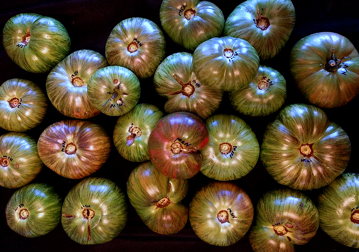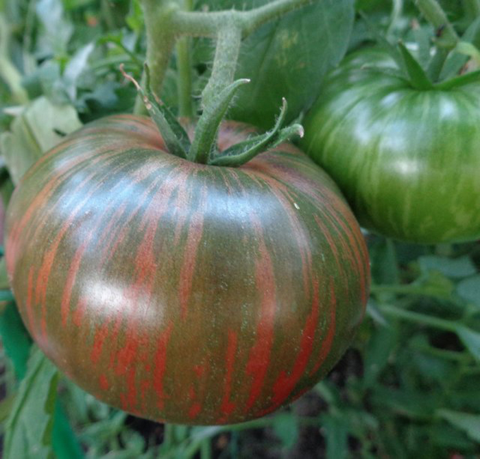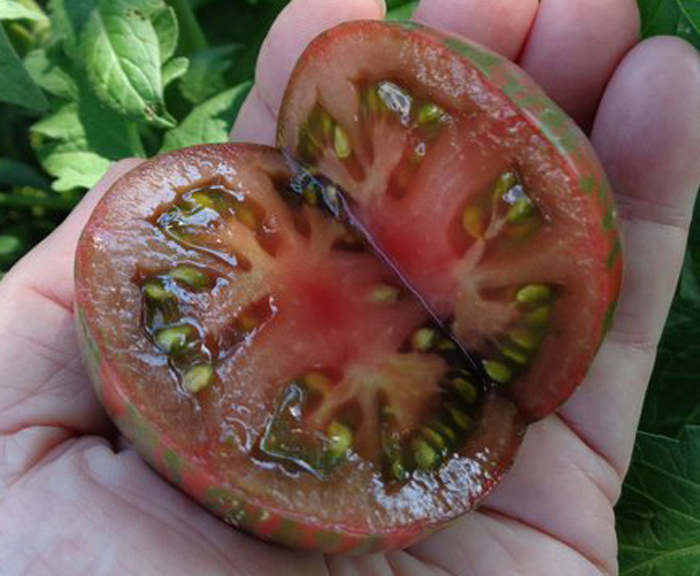 “Spectrum’s Surpriz” sprung from a sharing of unstable seeds from the “Surpriz” variety. It was discovered in 2013 and grown to stability by two members of the Doc and Katie’s Garden Xanadu (mostly) tomato forum. Laura-in-FL grew hers in Florida, and Tomike grew his in Quebec, Canada. It is hard for me to think of two more dissimilar climates, yet Spectrum’s Surpriz thrived in both locations. This is a purple-fleshed medium beefsteak with green stripes and a dusting of anthocyanin on top (when exposed to the sun). I have found a bit of variation in shape (more round than oblate) and size (small versus medium beefsteak) on the same plant, with the smaller rounder fruits coming at the end of my season when the plants are exhausted. “Flavor is a true tomato flavor with both sweet and tangy notes, but it leans a little toward sweet.” This variety has been grown since 2013 and does appear to be stable. Please note that these are not my photos. They are photos taken by the growers and used with their permission.