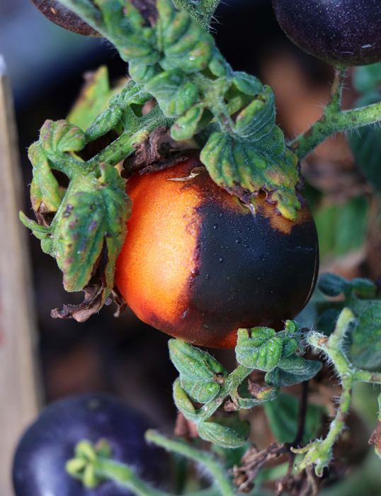 The productivity was less than for Inkspot, but Inkspot makes a taller, more slender plant and does not struggle quite as much in the heat (although it doesn’t really like intense heat either). The cherries on Tartufo were larger and squattier, and were not as sweet as those of Inkspot, but there was good full tomato flavor. So, if Tartufo likes your growing conditions, it will probably produce better for you and you will have this nutritious big cherry with lycopene and anthocyanins as well as a big bold flavor in your lettuce salads. 🙂