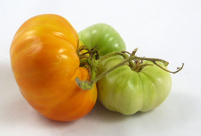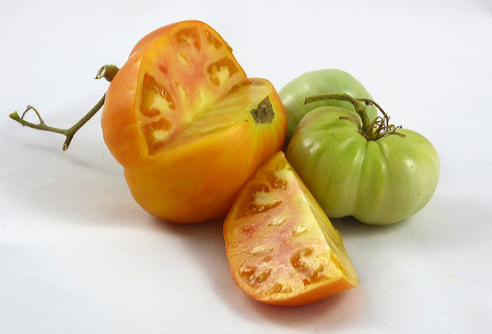 “Yellow Barn” is big yellow (possibly bicolor) beefsteak, very pretty and abundant setter of good sized beefsteak fruits that become more colorful as the fruits ripen in the heat. It is seedy, juicy and meaty. Yellow Barn was found in a patch of pink “Mexico” tomatoes by Bruce Van Order of Freeville, New York.