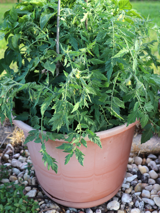 The photo of the plant shows the wispy rugose leaves. There is a pepper plant in the same pot behind it, so I cropped the photo to show the height of the tomato plant, without the taller pepper leaves behind it.